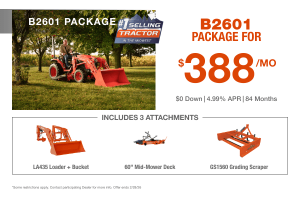 **Not including Incentives,Insurance,Ex. Warranty, and K-maintenance Kubota Disclaimer Only Kubota and Kubota performance matched Allied equipment are eligible. Inclusion of ineleigible equipment may result in a higher blended APR. Stand Alone Kubota or Allied implements and attachments/accessories are subject to stand alone programs. Financing is available through Kubota Credit Corporation, U.S.A; subjecto to credit approval. Program eligibility requirements are subject to change without notice and may be withdrawn without notice. Some exceptions apply. See dealer or go to KubotaUSA.com for more information