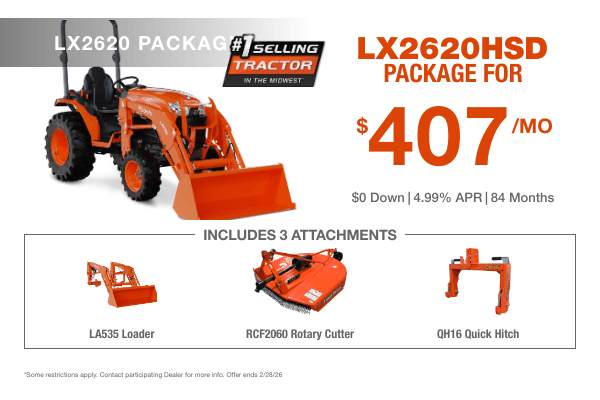**Not including Incentives,Insurance,Ex. Warranty, and K-maintenance Kubota Disclaimer Only Kubota and Kubota performance matched Allied equipment are eligible. Inclusion of ineleigible equipment may result in a higher blended APR. Stand Alone Kubota or Allied implements and attachments/accessories are subject to stand alone programs. Financing is available through Kubota Credit Corporation, U.S.A; subjecto to credit approval. Program eligibility requirements are subject to change without notice and may be withdrawn without notice. Some exceptions apply. See dealer or go to KubotaUSA.com for more information